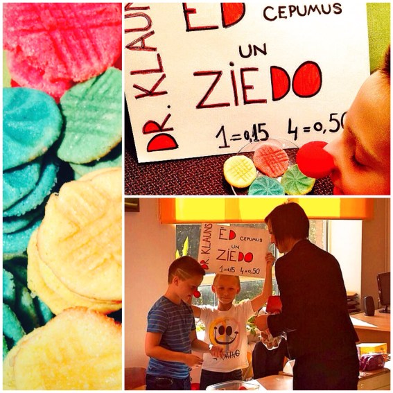 Lai skolas tirdziņam būtu saturs, izlēmām par labu misijai – par visu cepumu naudu nopirkām sarkanos Dr.Klauna degunus! Lai piesaistītu vairāk “pircēju”, cepām dikti krāsainus cepumus! IZDEVĀS!